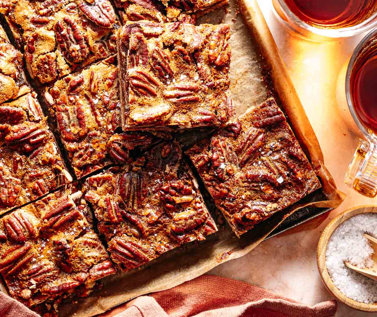 - Laat de pecan pie volledig afkoelen en snij daarna in repen of blokjes. Strooi er eventueel nog wat extra grof zeezout overheen voor een mooi zout/ zoet effect. Eet smakelijk!